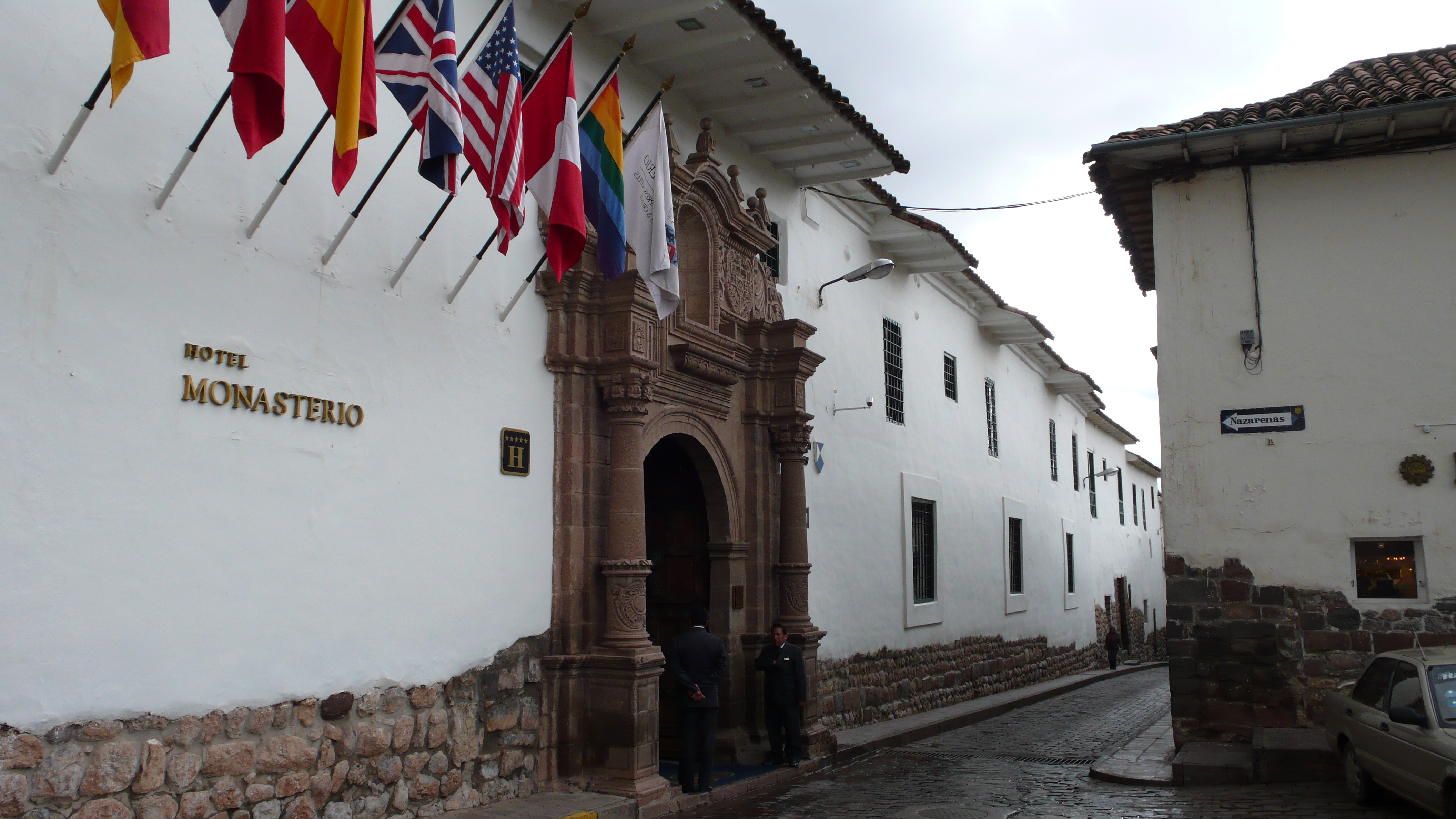 Arriving at the Monasterio Hotel proved that Davison had made another fine selection for our accommodations! This hotel is an Orient Express hotel, like the Miraflores Park Hotel in Lima. Its right in the center of Cusco, in the “old quarter” and was built as a monastery by the Spaniards on the foundations of an old Incan palace in the 16th Century! Soft Gregorian Chants and Midaevel music waft through the halls and stone arched rooms on the sound system. The walls are about three feet thick, and the narrow streets outside cobblestone! Everywhere we walk, and walking is the only way to see Cusco, we see Incan stone walls along the streets. One street near the hotel is called “Siete Culebras” (Seven Snakes) for the seven images of snakes carved on the ancient Incan blocks! The image of the snake is common on their pottery and stonework, as they attribute great knowledge and wisdom to that creature.
