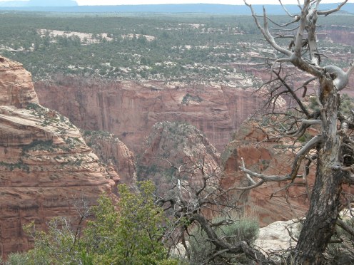 If we were able to travel the prehistoric road directly west out of Pueblo Bonito, about 90 miles as the crow flies, up and over the Chuska Mountains (on the border of Arizona and New Mexico) sprawls the three-canyon National Monument commonly referred to as “Canyon de Chelly”, our next destination. No straight-as-an-arrow path was available for us today, though, for we must follow our modern road system which take us on a wide arcing route through the Four Corners area of Northwest New Mexico and Northeast Arizona, and then south by southwest through vast landscapes. This is true “Indian Country” with towns named Yah-Ta-Hey and Fort Defiance, Window Rock, Navajo and Zuni. Just up-canyon from the town of Chinle, Arizona and outside the main entrance to the Canyon, we settle into the Cottonwood Campground next to the Thunderbird Lodge (with a restaurant and bar!) unhitch the trailer and go for a drive to see tomorrow’s horseback trek destination: Canyon de Chelly.