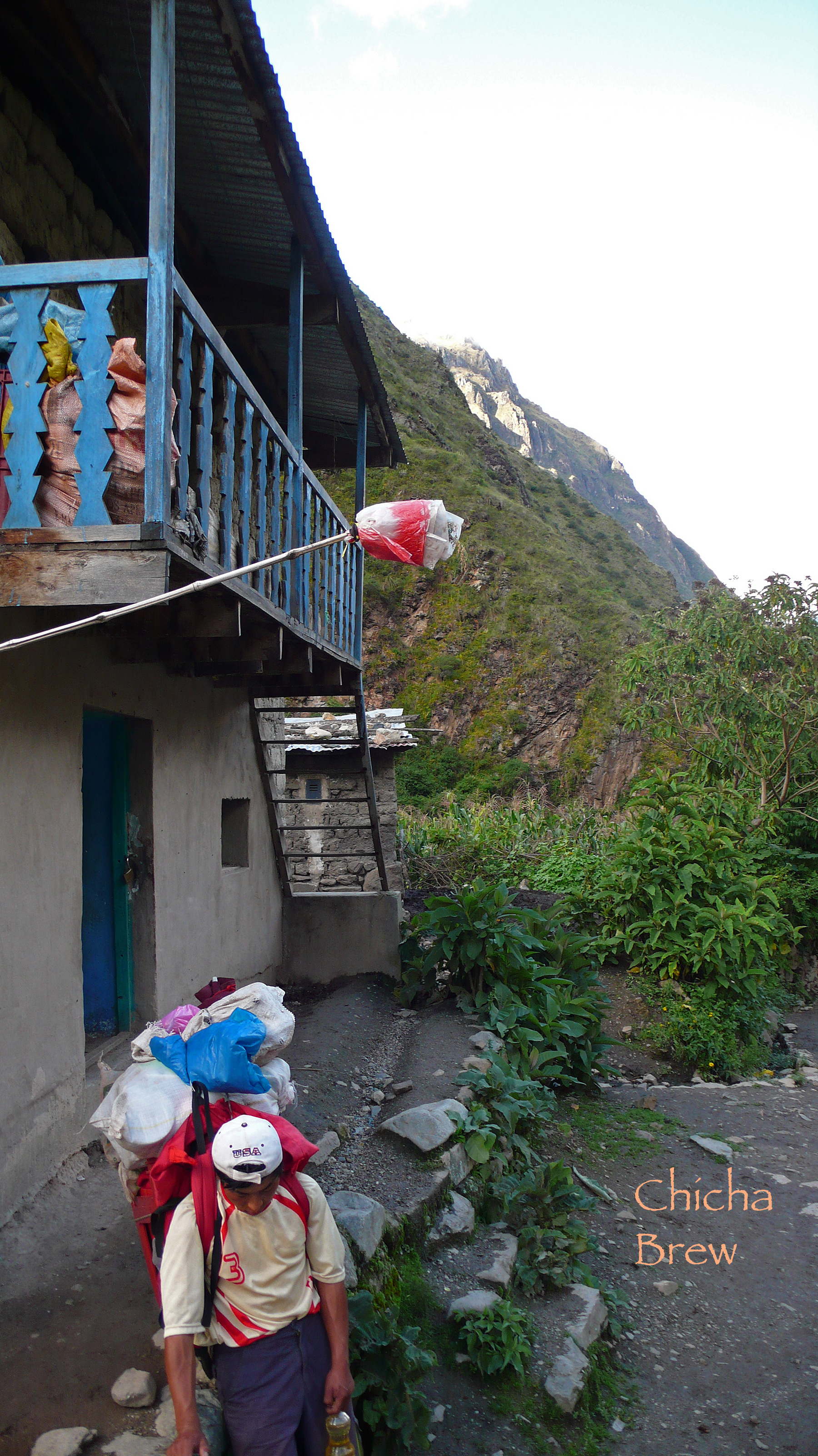 The orange bag at the end of the pole is the universal "sign" advertising Chicha for sale inside; this in the village of Wayllabamba on the first night of the Inca Trail trek to Machu Picchu.