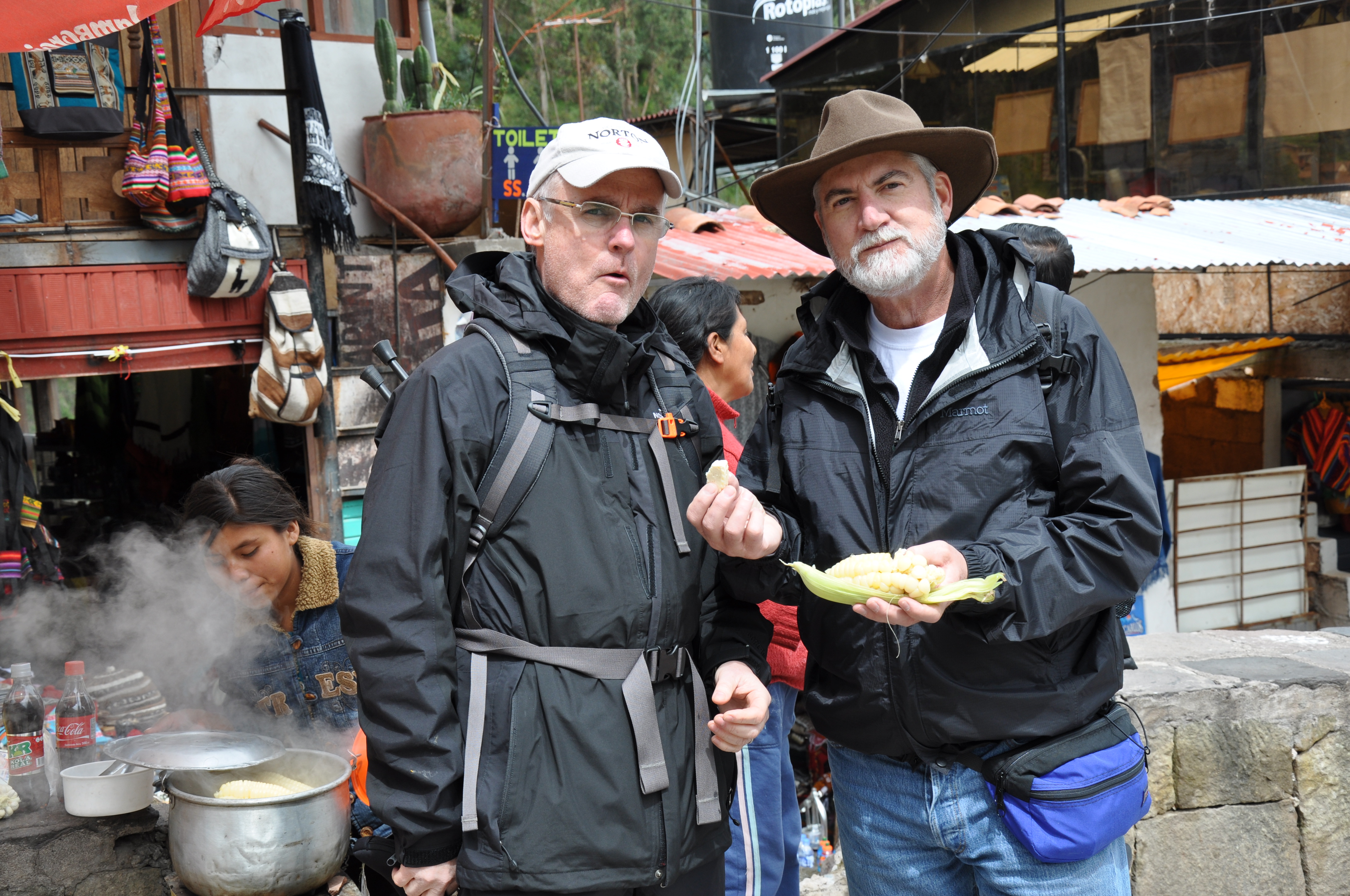 Before we leave for the trek on the Inca Trail, on a hike to the ruins of the Inca fortress of Saqsaywaman high above Cusco, we stop for a local treat from a street-vendor: Choclo Con Queso (Andean Corn and Cheese). There, Multhauf and I enjoy a couple of boiled ears of the sweet, fat-kerneled, white corn served up with a chunk of fresh cheese. Yum!