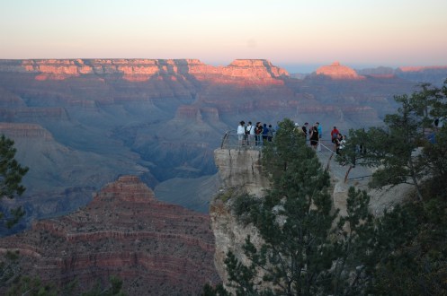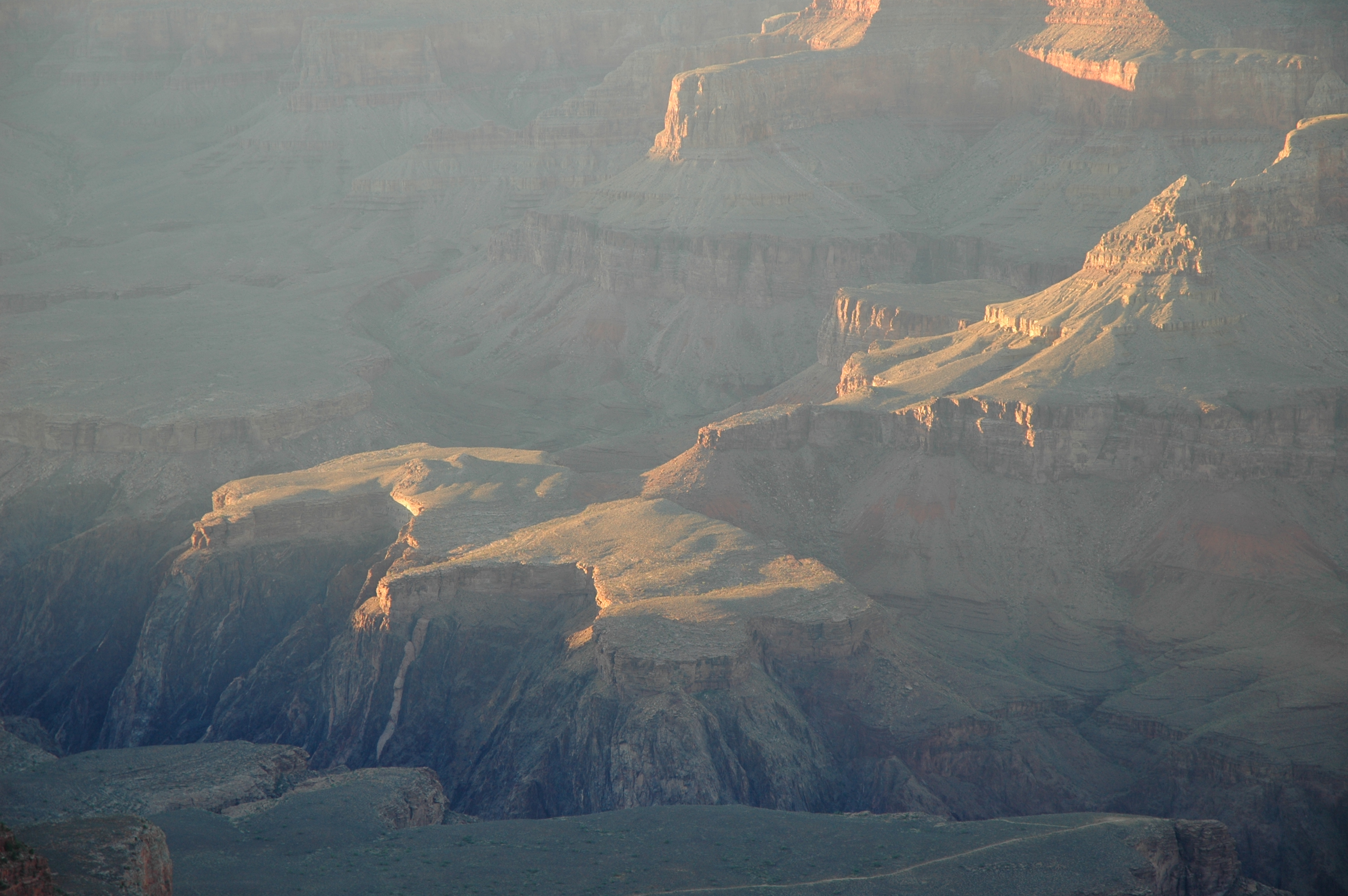 So, the plan was to take two major hikes over the three days, both into the Canyon and down as far as we could reasonably get before turning back to climb back up to the South Rim. That first evening we arrived from Phoenix Sky Harbor Airport via Flagstaff, after checking into the Red Feather Lodge in Tusayan and driving to Grand Canyon Village, was spent walking to Mather Point and then along the Rim Trail to the east in order to get away from the tour groups and buses. It allowed us to get acclimated to the altitude along the Rim – from 6,900 to 7,100 feet above seal level. What astonishing views greeted us from Mather Point and the Rim Trail as the sun set and the long-angled rays caught the far side of the Canyon!