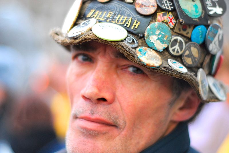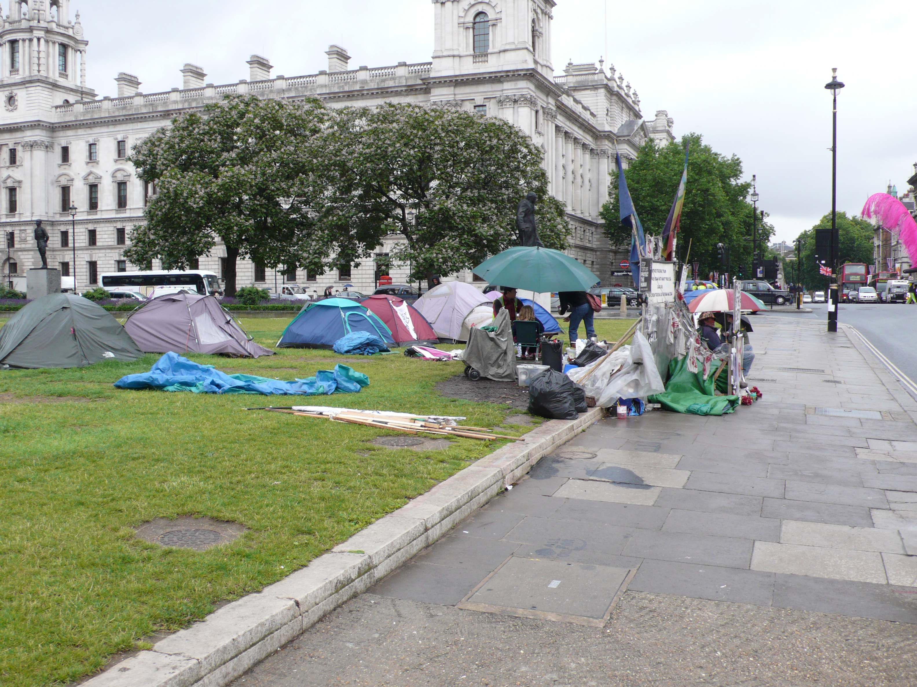 Right off the bat, a real surprise: At the very beginning of the walking tour, we find Brian William Haw (born 1949) who is an English protestor famous for living in a “war protest peace camp” in London’s Parliament Square. Although he had begun his protest before the September 11th 2001 terrorist attacks on the United States, Haw became a symbol of the general anti-war protest movement over the policies of both Britain and the United States in Afghanistan and later in Iraq. He was voted “Most Inspiring Political Figure” at the 2007 Channel 4 Political Awards (London). On June 2nd 2001, he began his quiet, peaceful one-man political protest. Now, he is often joined by other volunteers. By his own account, he was first inspired to take up his vigil after seeing the images and information produced in England by the Mariam Appeal, an anti-sanctions campaign. Haw justifies his protest on a need to improve his children’s future. He only leaves his makeshift campsite in order to attend court hearings, surviving on food and donations brought by supporters.
