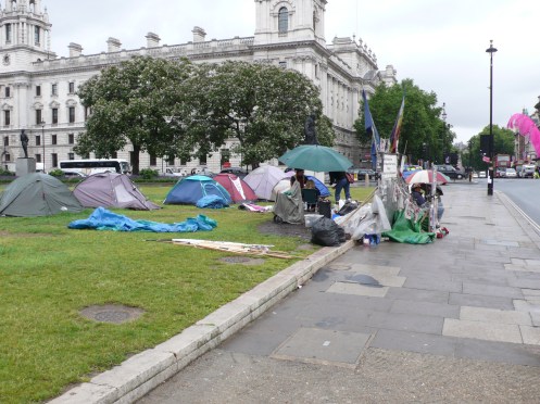 The juxtaposition of the statues of both Churchill and Cromwell with the peace protesters camped at their feet in front of Parliament was an ironic image. I gave them some spare change out of some spark of empathy from the days of my youth. Churchill’s scowl, looking down on the motley crew huddled in the rain, couldn’t have seemed more appropriate!