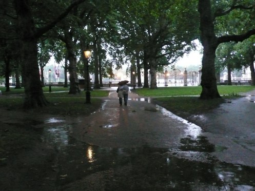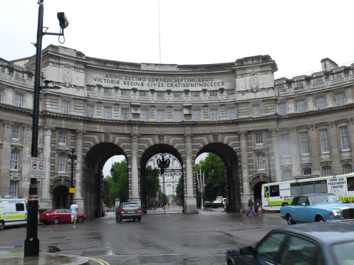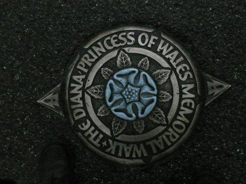 But, it is getting late and I cannot tarry, so out I stride into the late Saturday afternoon squall and hang a left before the Green Park tube station, along the “diagonal path” into Green Park. Here, during good weather, you can sit in one of the many deck chairs spread out on the lawn and an attendant will appear out of nowhere to serve you. Green Park was named such due to the absence of flowers, and was a preferred location for both duels and balloon ascents in years gone by. Nearby is Spencer House, once the ancestral home of the House of Spencer – the late Diana Princess of Wales’ family. You will notice several beautiful markers indicating the “Diana Princess of Wales Memorial Walk” set into the diagonal path you are following toward Buckingham Palace.
