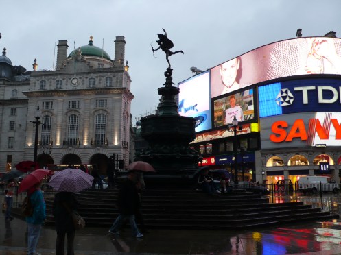 WEST END, LONDON, ENGLAND June 30th – Sometimes the best laid plans are nought when Mother Nature takes her way. The longest of the www.AudioSteps.com London walking tours was of the West End, which is 4.9 miles long and has 30 point-of-interest stops. It is a grueling walk to tackle in the three or four hours as I had planned, even in good weather. Following lunch on Saturday, after getting a bit of rest from the morning’s walking tour of the Tower and City, I head out into what became a very rainy afternoon’s exploration of the West End of London. I must emphasize that, when I say rain, I don’t mean a light drizzle such as we get in West Texas, I mean that steady drum of heavy drops and slashing wind that washes London so frequently. This is the land of rain gear: umbrellas, rubbers and oil skins! Though the record of this part of the tour might be abbreviated due to quality and quantity of photographs, a direct impact of the heavy weather, the excitement of the adventure was no less diminished.