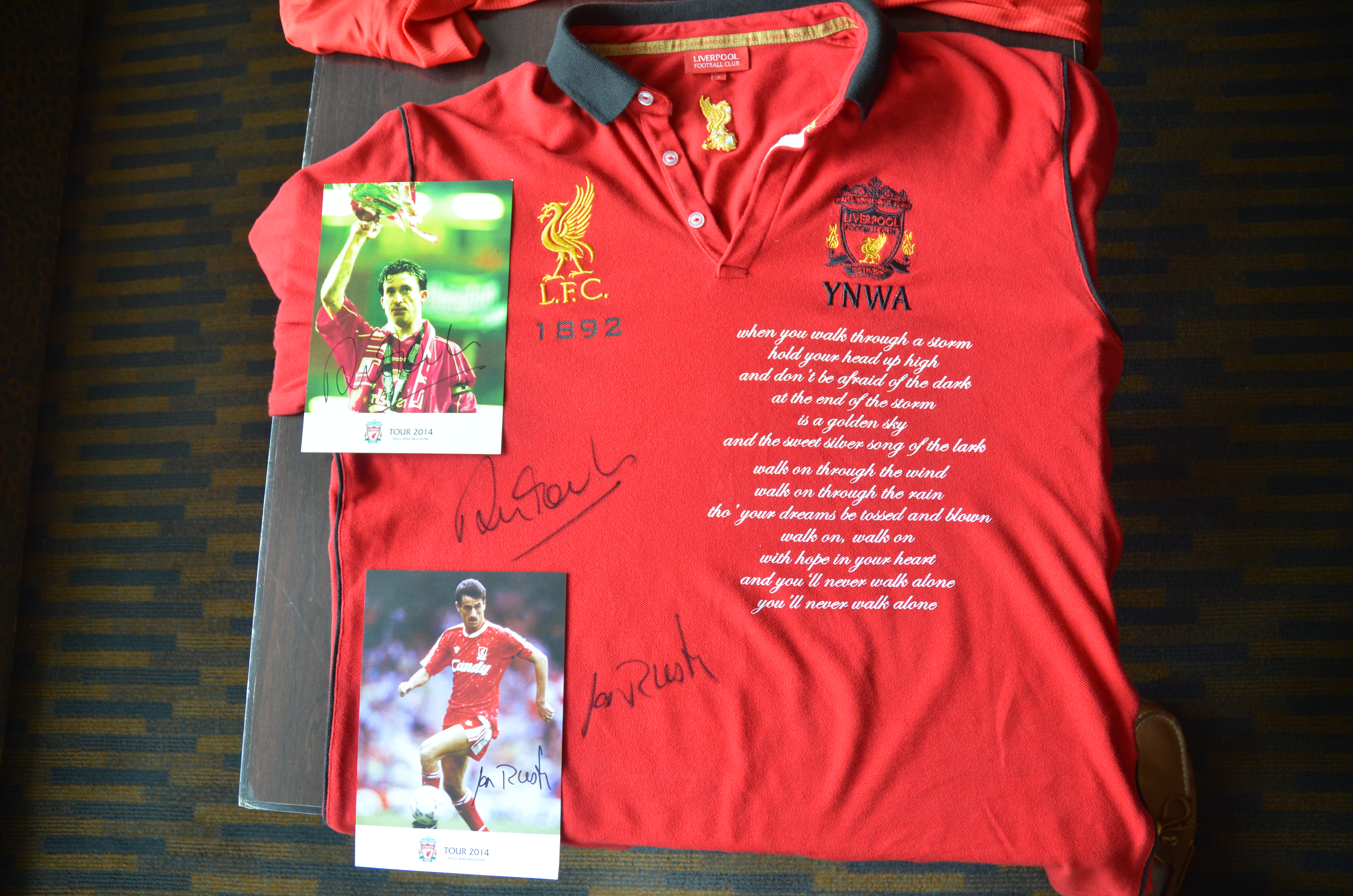Today I have one of the finest examples of framed, autographed Liverpool FC memorabilia hanging in my Great Room, above my pool table in a place of honor.  Robbie Fowler and Ian Rush signed both my shirt and each of their hand-out photos.  That shirt now serves as a permanent memory of an incredible Summer soccer adventure!