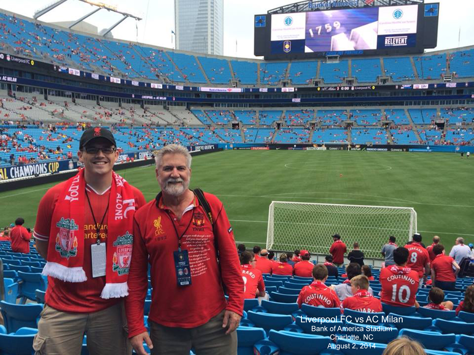 Charlotte, North Carolina the next weekend, at Bank of America Stadium on Saturday August 2nd against their old nemesis, AC Milan. After suffering through moving to my new office back in El Paso in the middle of the week, I flew east to Charlotte, NC  on Friday August 1st to meet my son-in-law Joseph Perry, who had discovered a new found sports affection for Liverpool FC, as well.  The City of Charlotte embraced Liverpool and it was fun to appreciate the lead-up events to the game. As if on cue Saturday evening, Liverpool won again, this time 0-2.