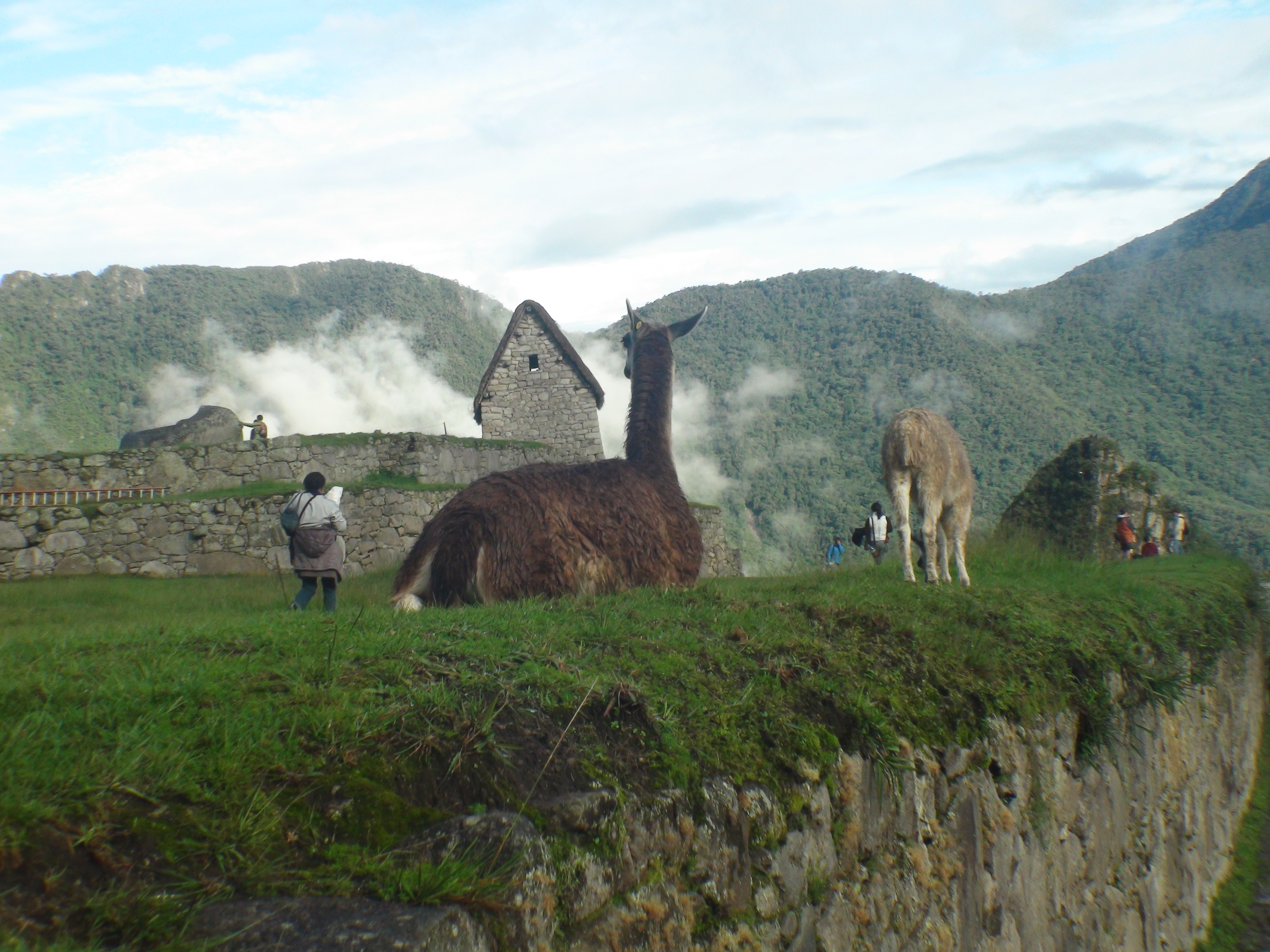 Llamas browsing along the trail into Machu Pichu from the Sun Gate, with the Hut of the Caretaker of the Funerary Rock in the background…