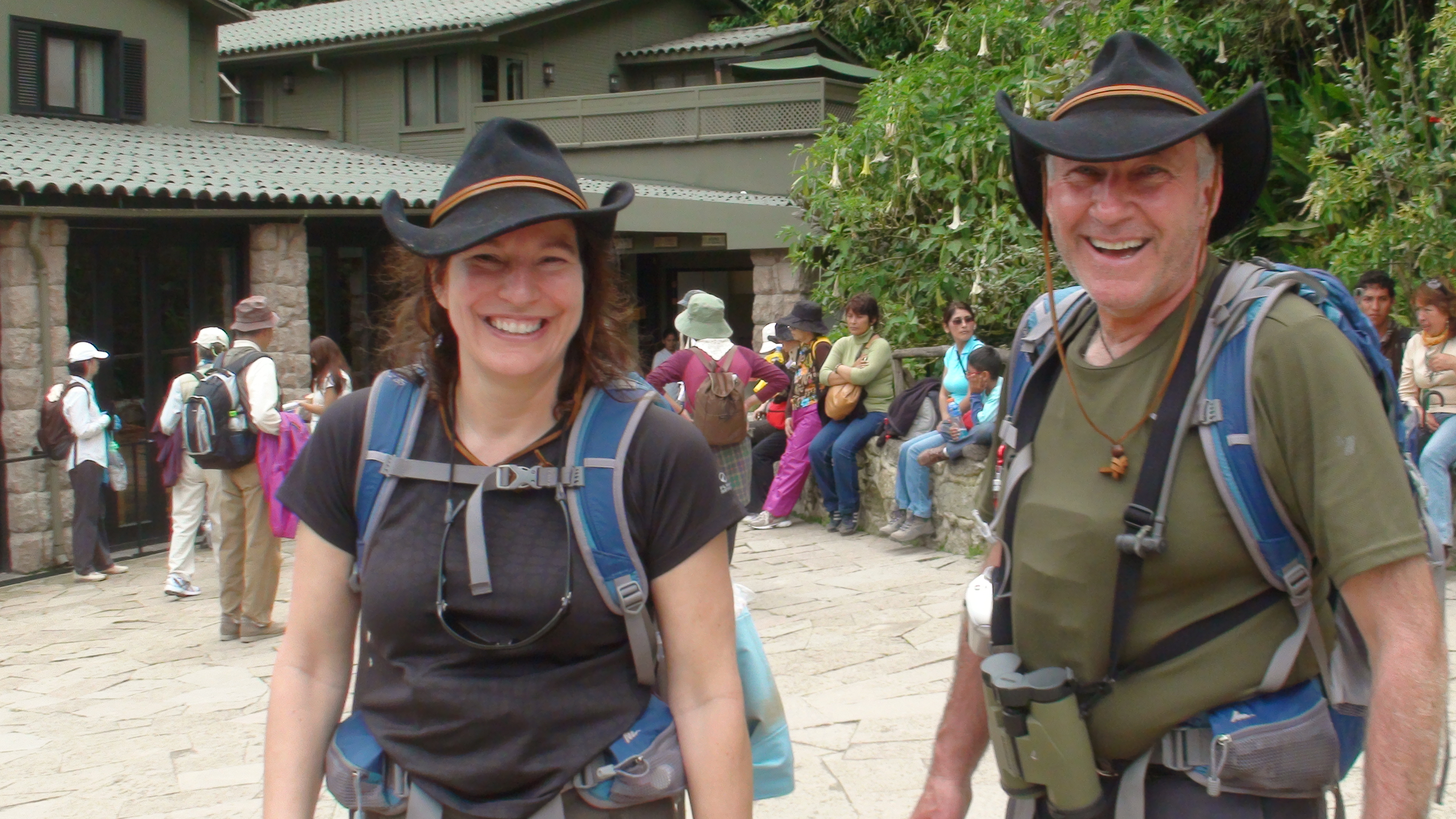 Chuck and Wife 2, newlyweds from Denver, saying goodbye to us at the main gate to Machu Picchu…with the Sanctuary Lodge in the background.