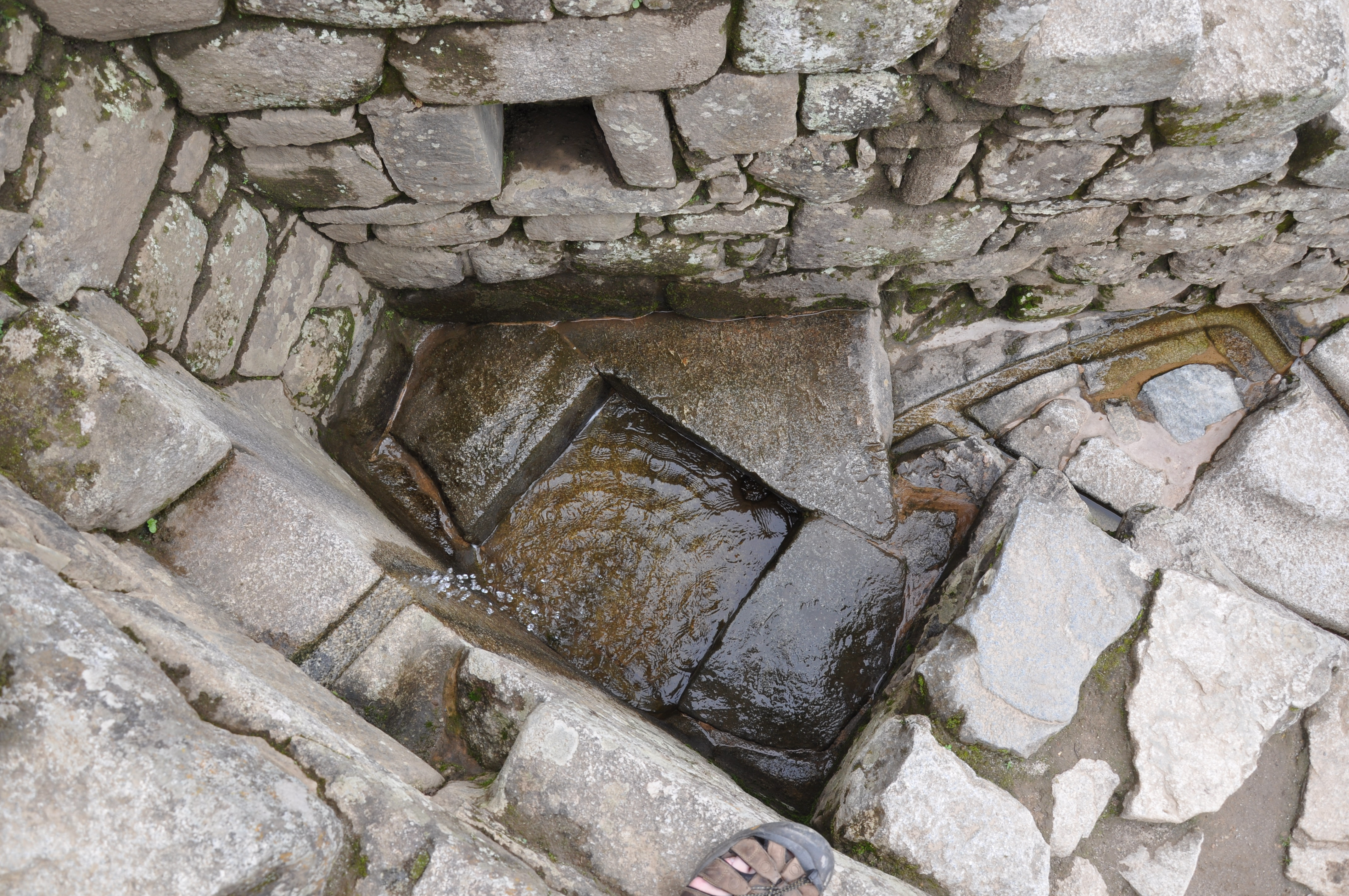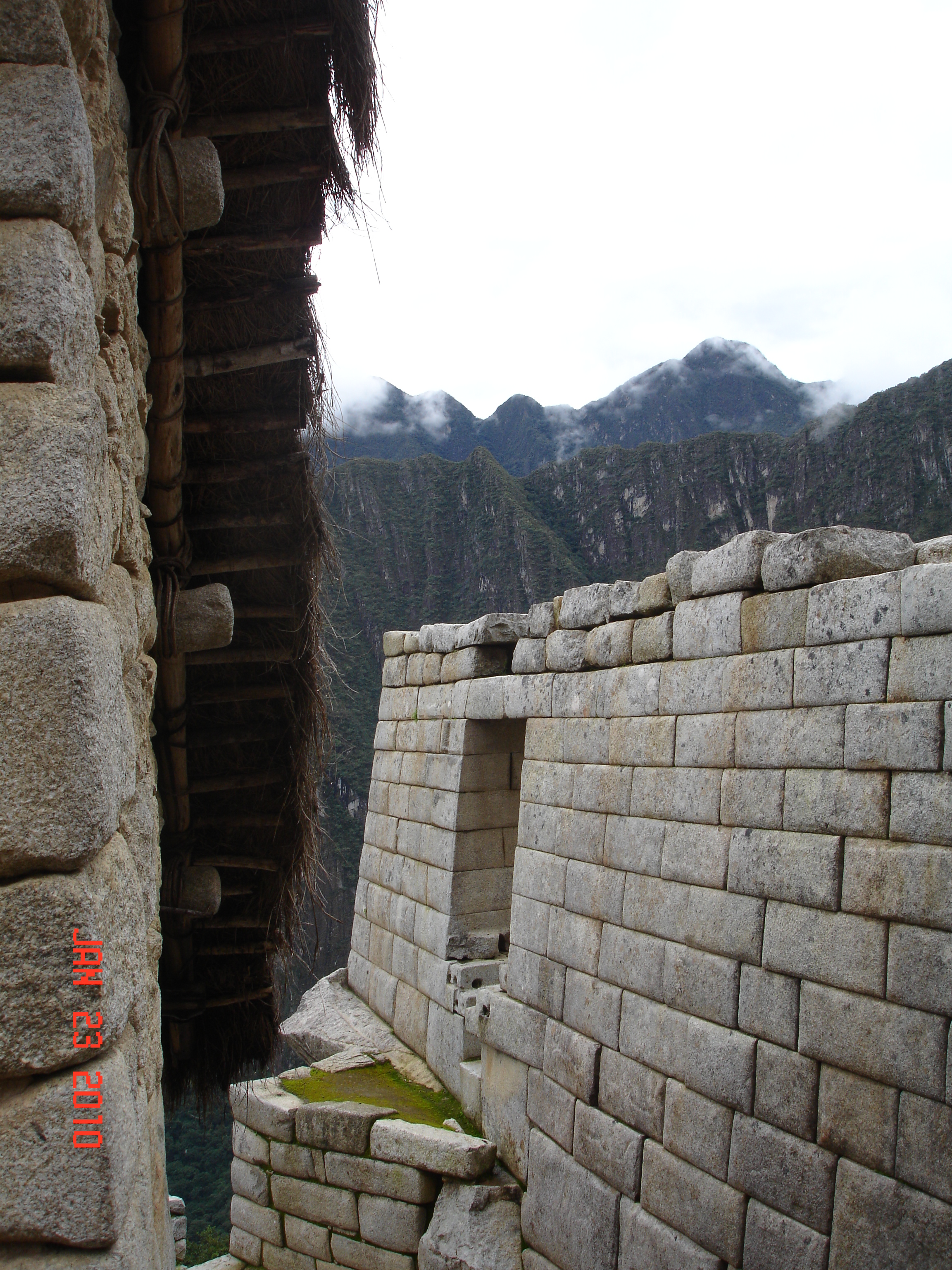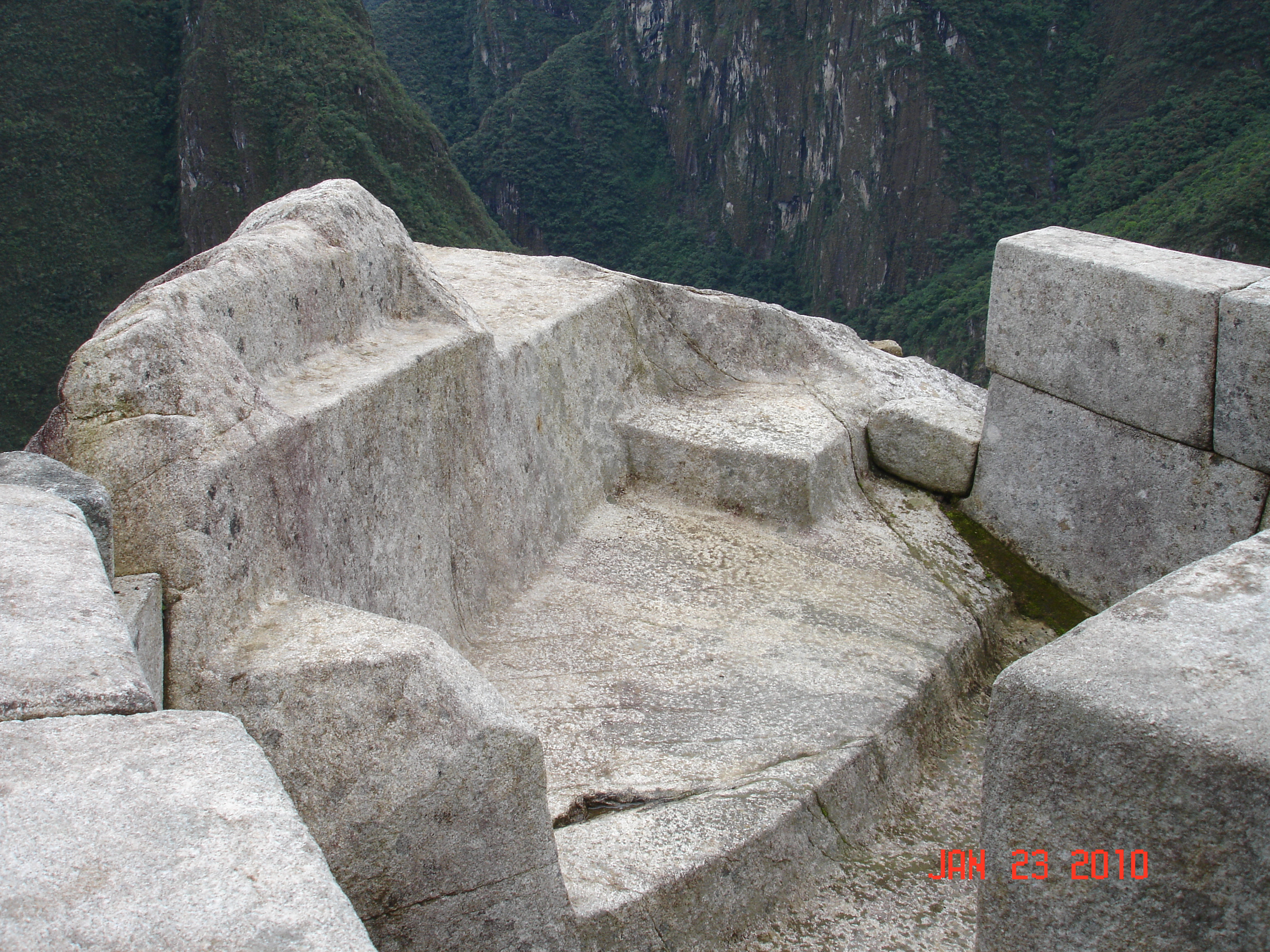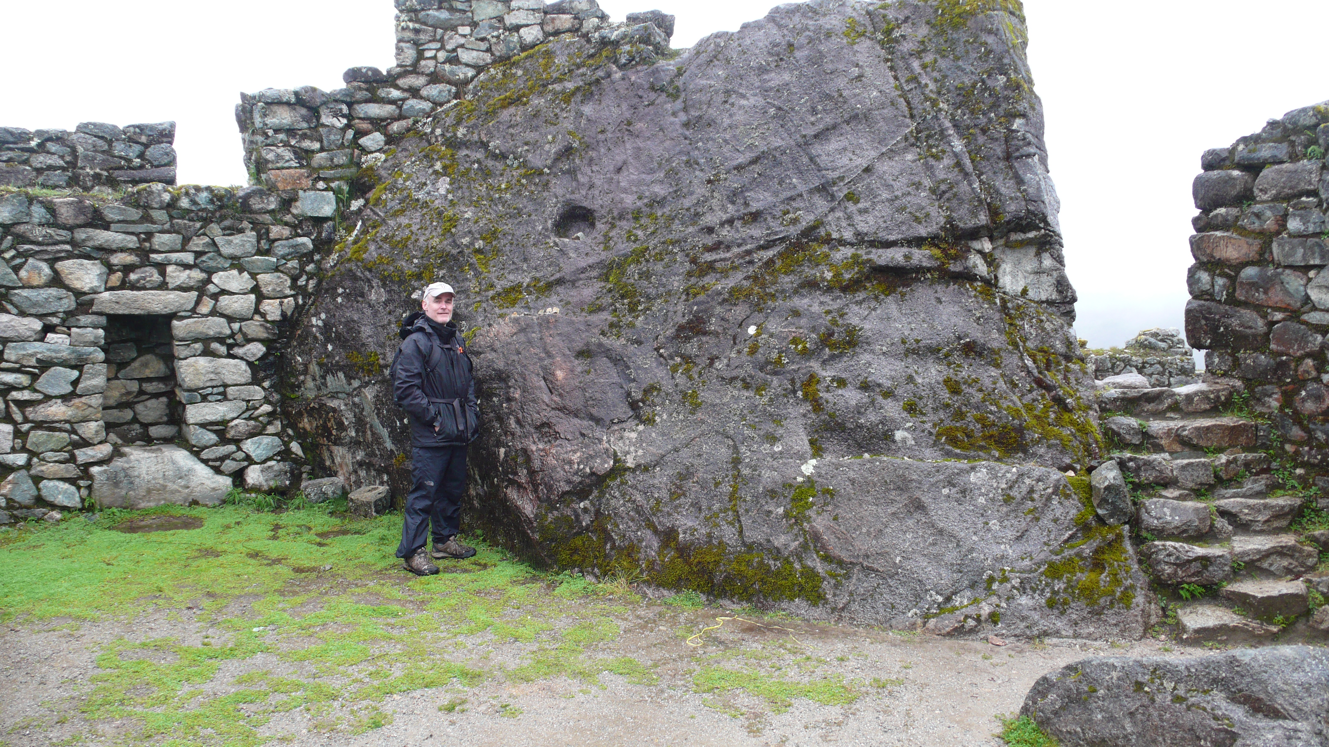 The Intiwatana might be the most famous stone at Machu Picchu, if not in Peru, for it is the only surviving “Hitching Post of the Sun”…and barely that! The Spanish conquerors destroyed all of the others that they found, but since this place was lost to them, this stone survived…until a few years ago! In one unbelievable accident which happened during the filming of a Cusquena beer commercial, a TV crew lost control of a crane that smashed into the top corner of the sacred rock, chipping off a big chunk…the missing corner can be seen today if you look carefully (right in the center of the above picture)!! Take care as you enjoy the walk through these ancient ruins.