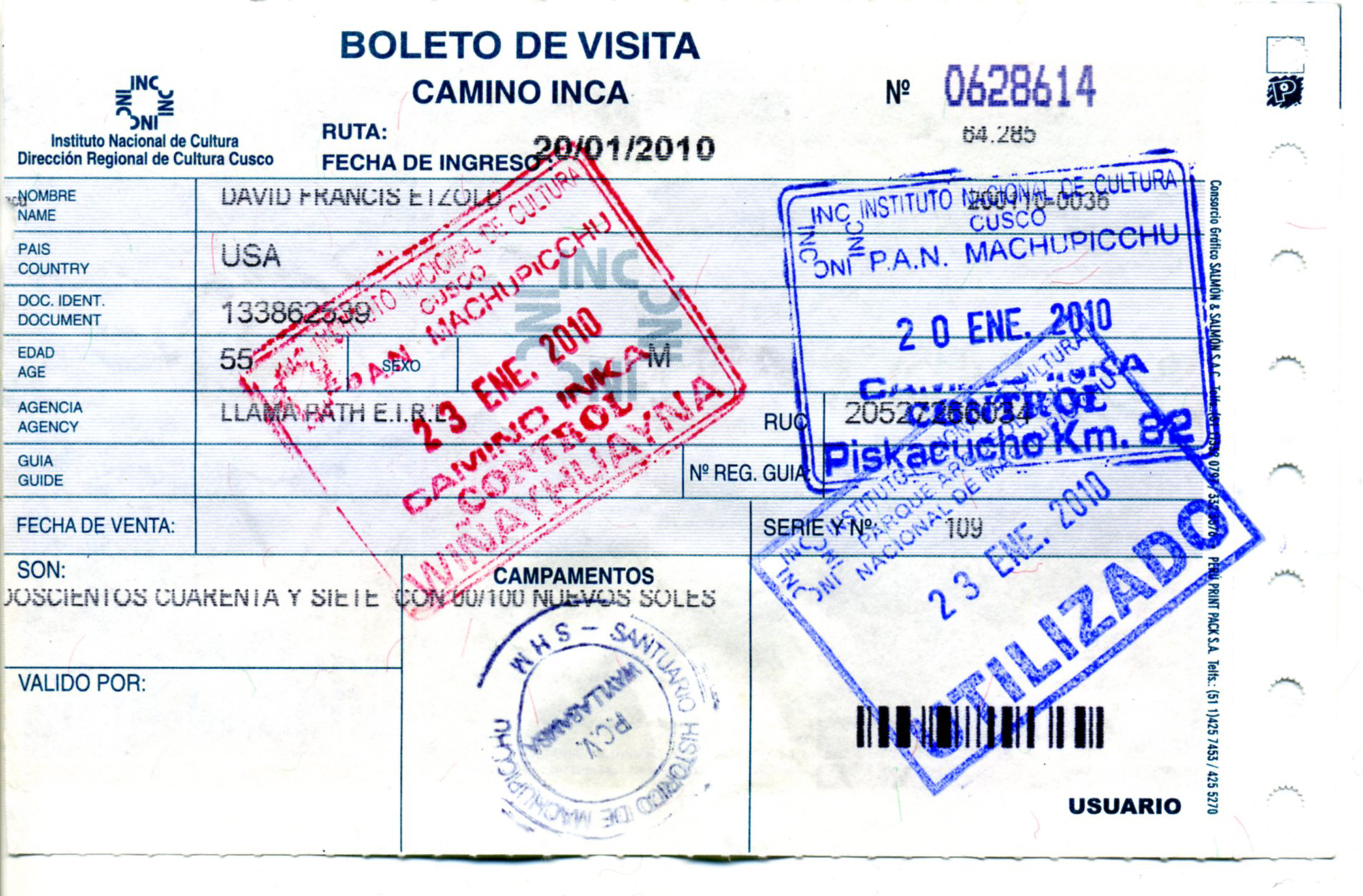 Etzold’s Inca Trail Ticket with all Official Stamps